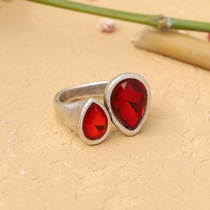 Antique Silver Baguette Ring: Bohemian Crystal Stone, Free Size