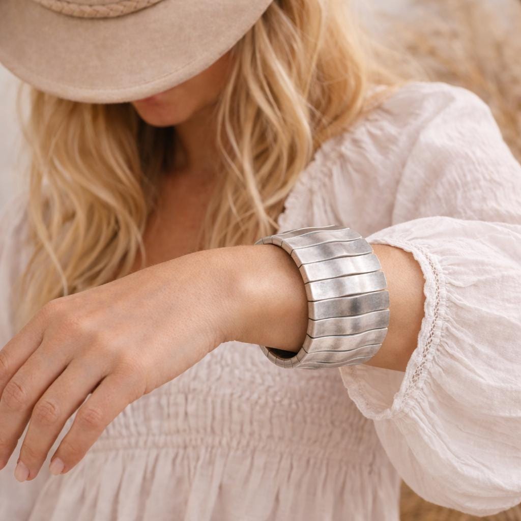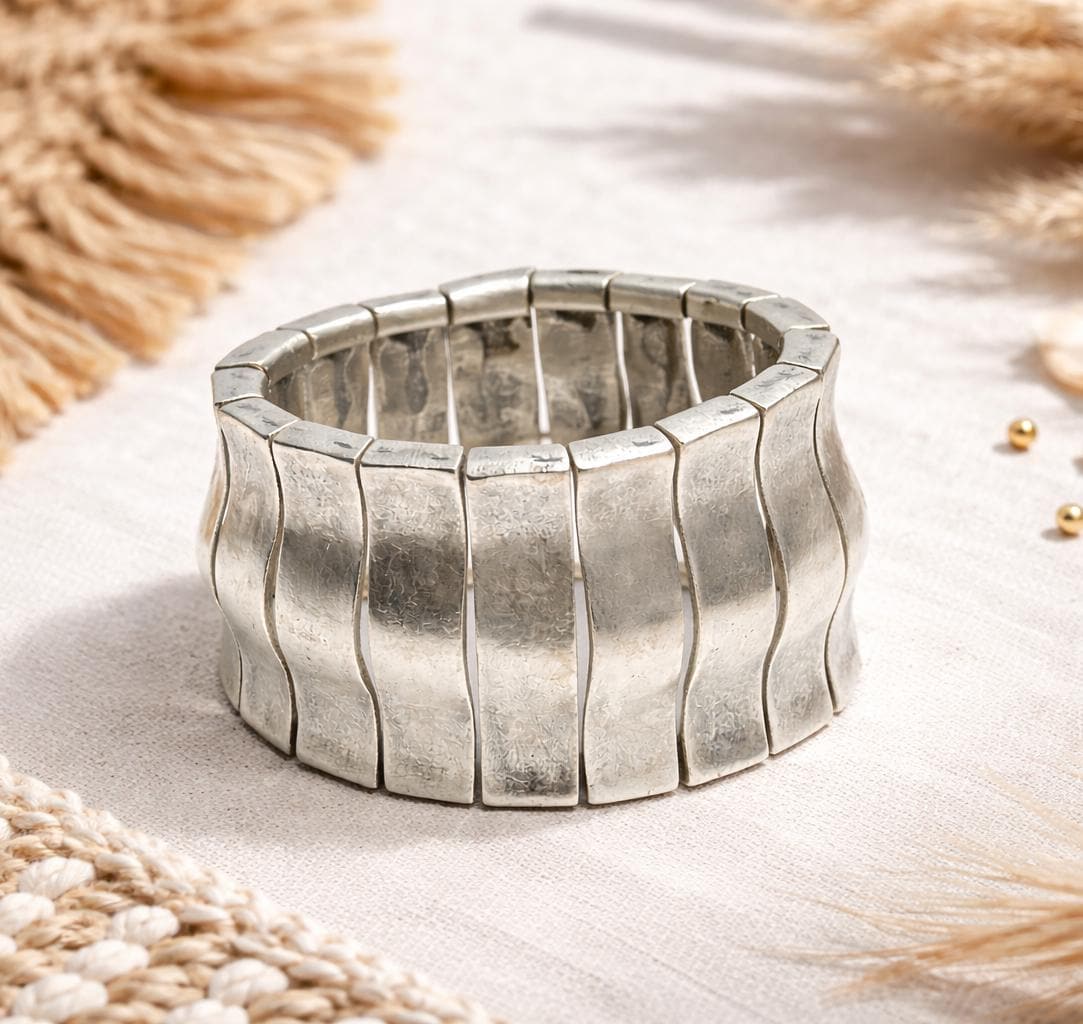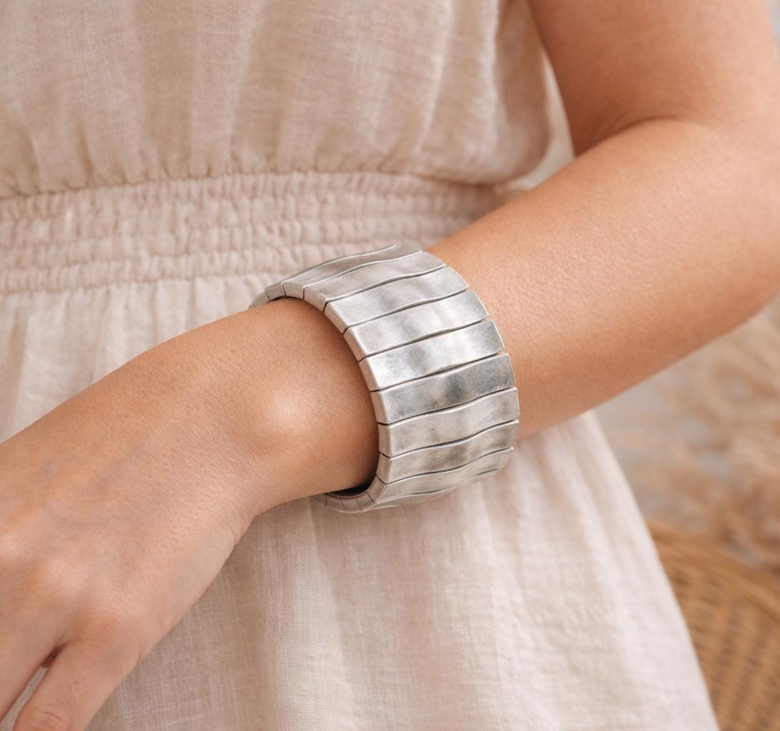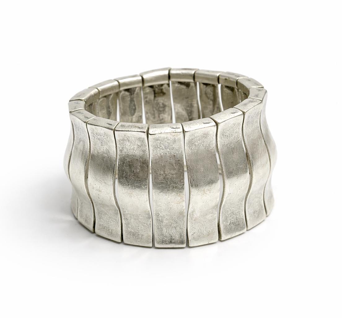 Art Nouveau Cuff Bracelet: Weavy Hummered, Silver Plated Brass